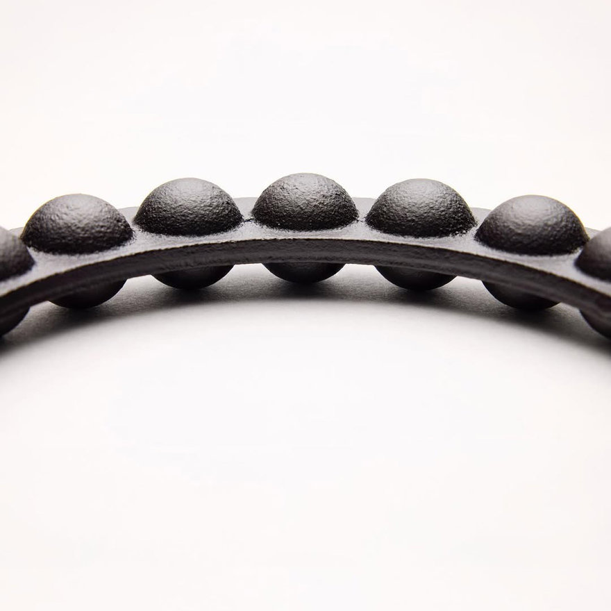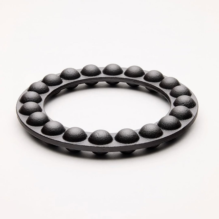 It's made of cast iron, but possesses a form that would have been unimaginable in cast iron's heyday, containing twenty spheres around its perimeter; the object's name is perhaps a wink at pearl necklaces.