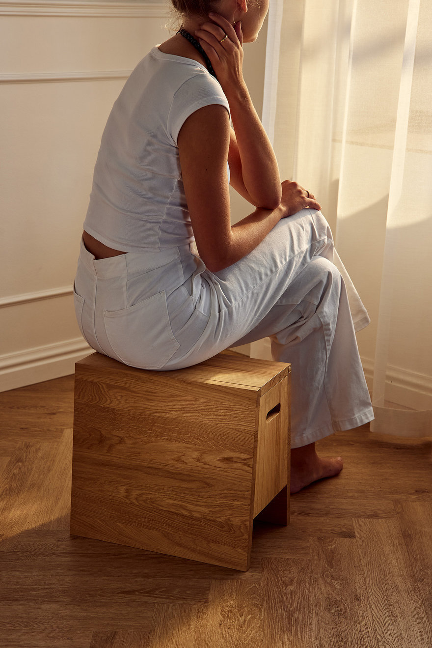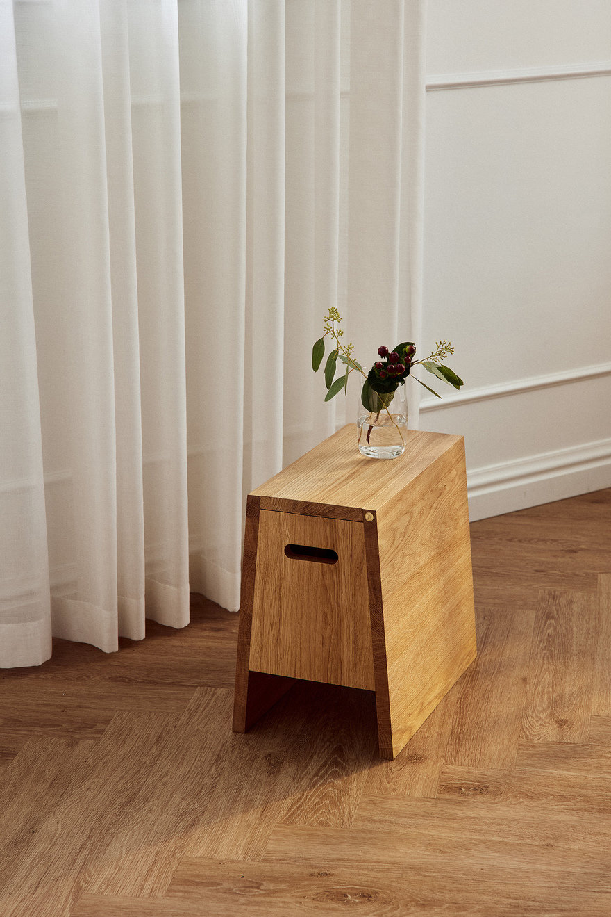 Inspired by the form of a gymnast's vault, her aim was to make a simple, elegant stool and storage piece.